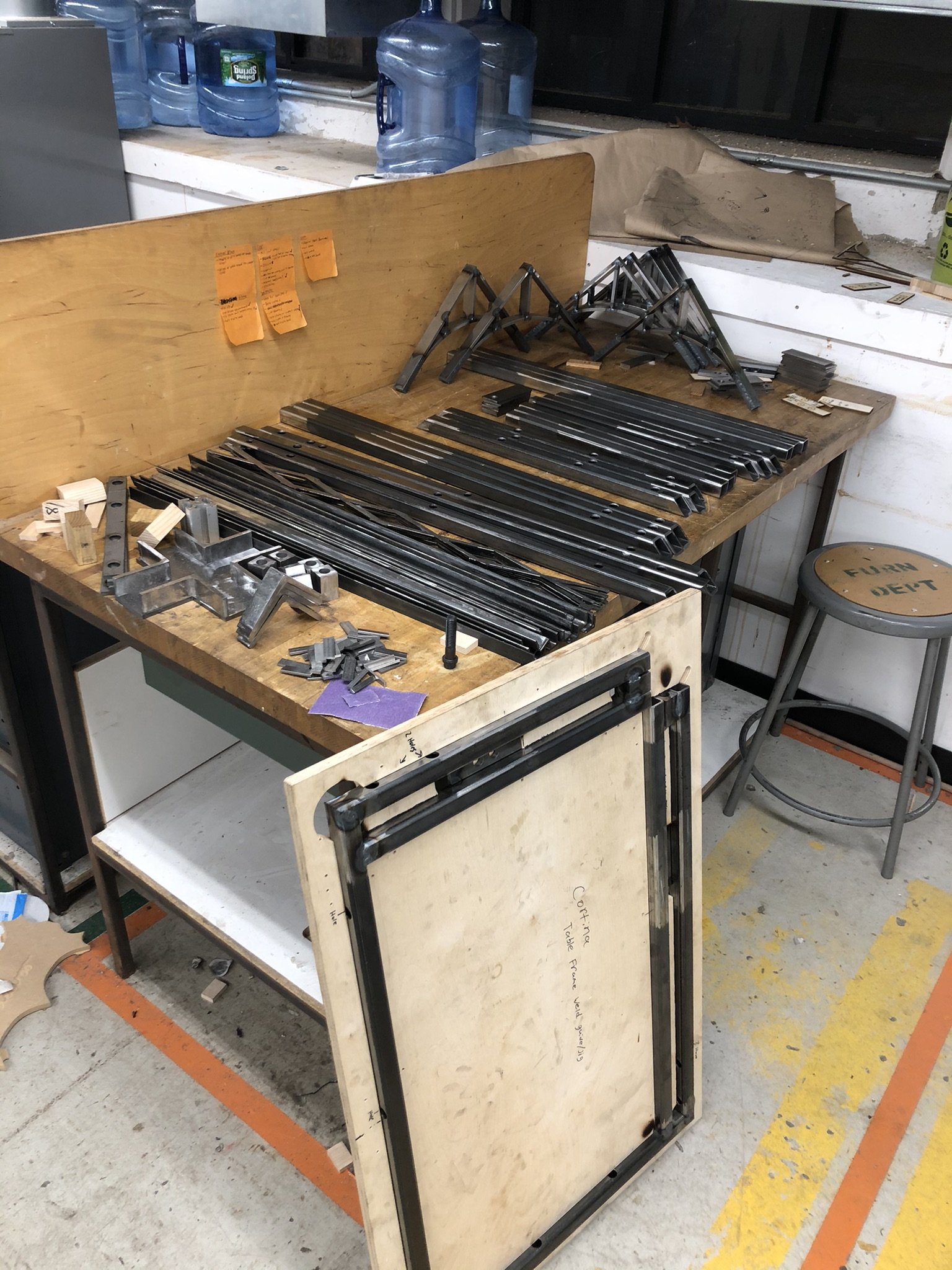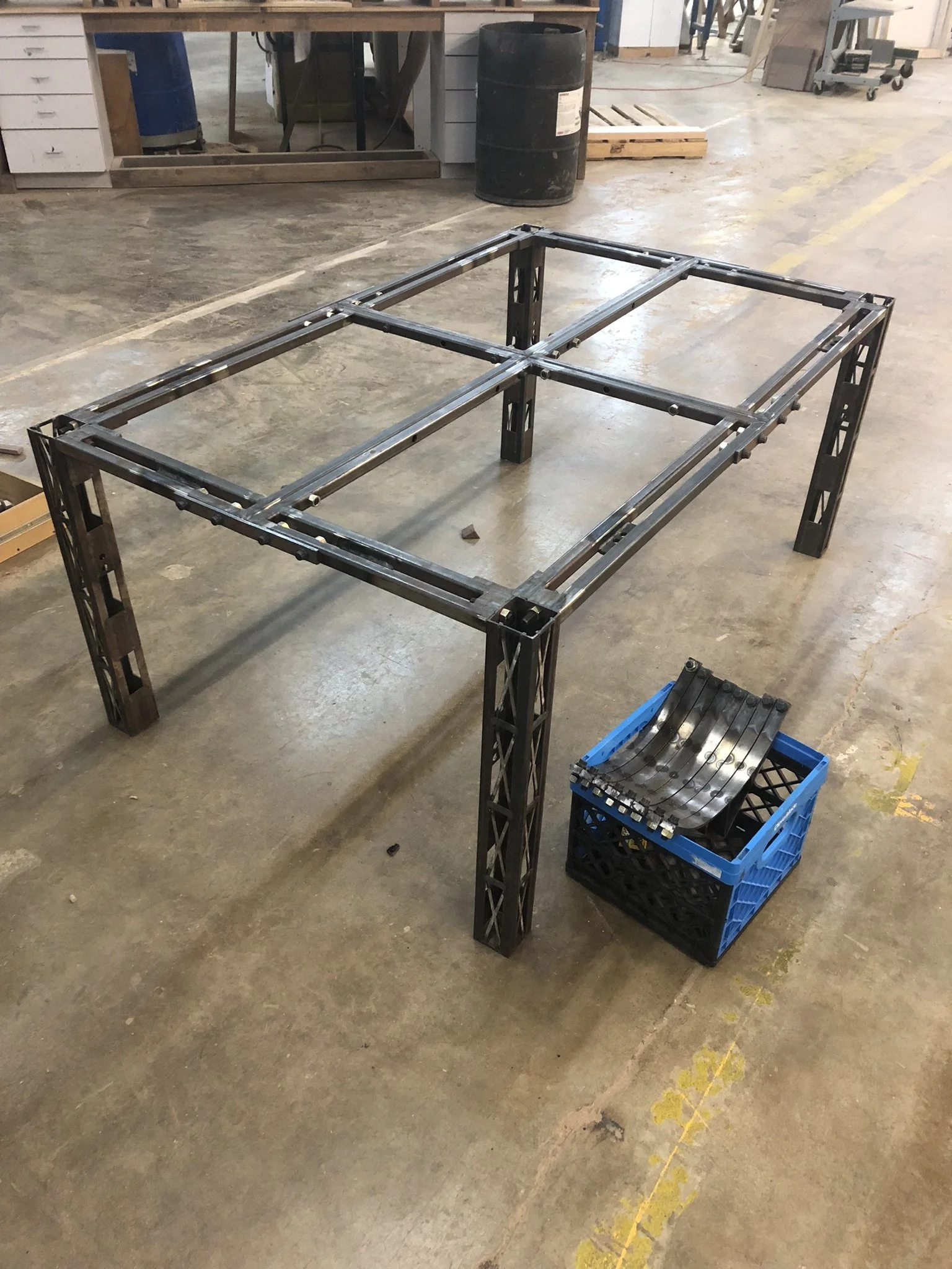 This table is inspired by the structure of cantilever bridges. Like cantilevers, the entire top is supported by a subframe that spans the distance between each corner, akin to the body of a bridge supporting the road-deck above. Also like bridges, the entire table is assembled from many smaller parts, and can even be disassembled for transportation. The largest part of the 6-foot by 4-foot table is a 2x3-foot flat frame from the substructure. The solid maple top even splits into four quadrants so it can be moved with little effort.