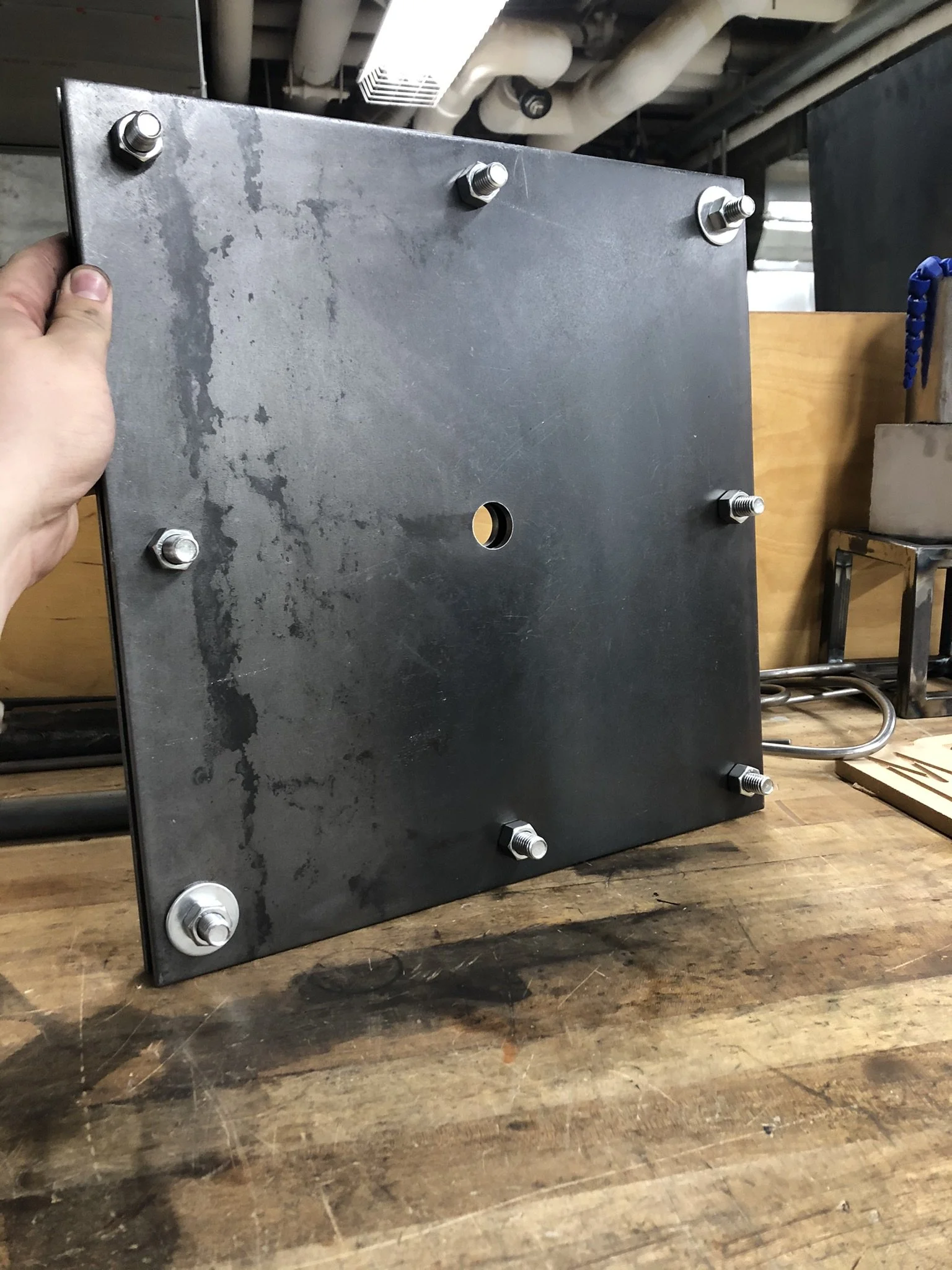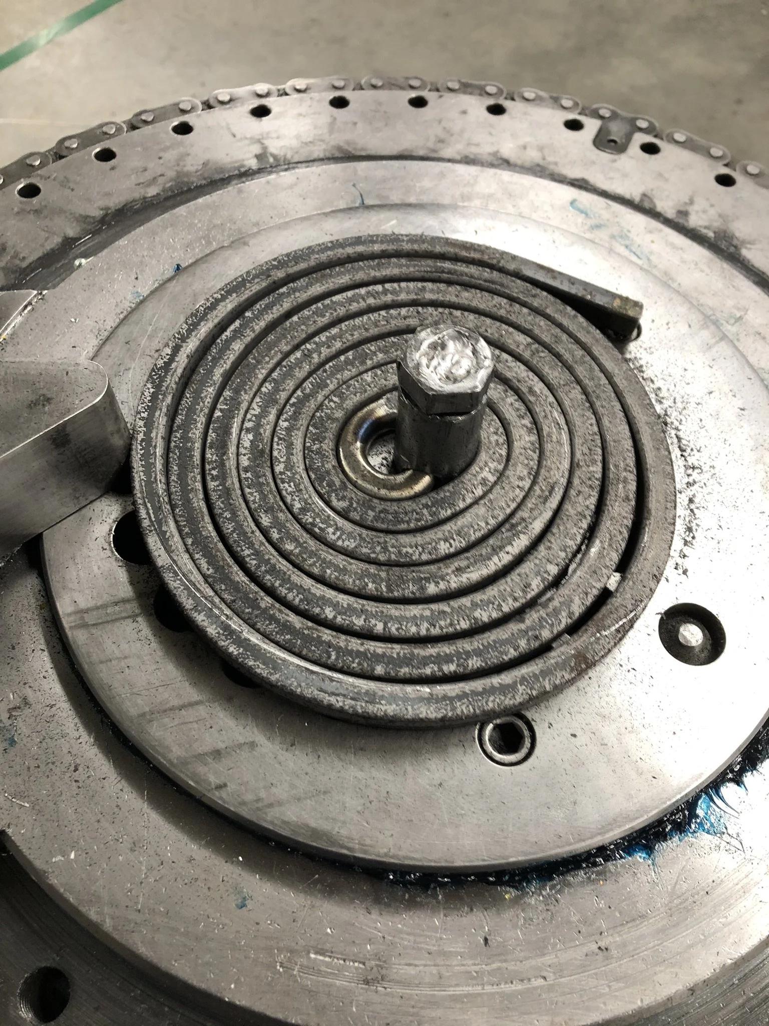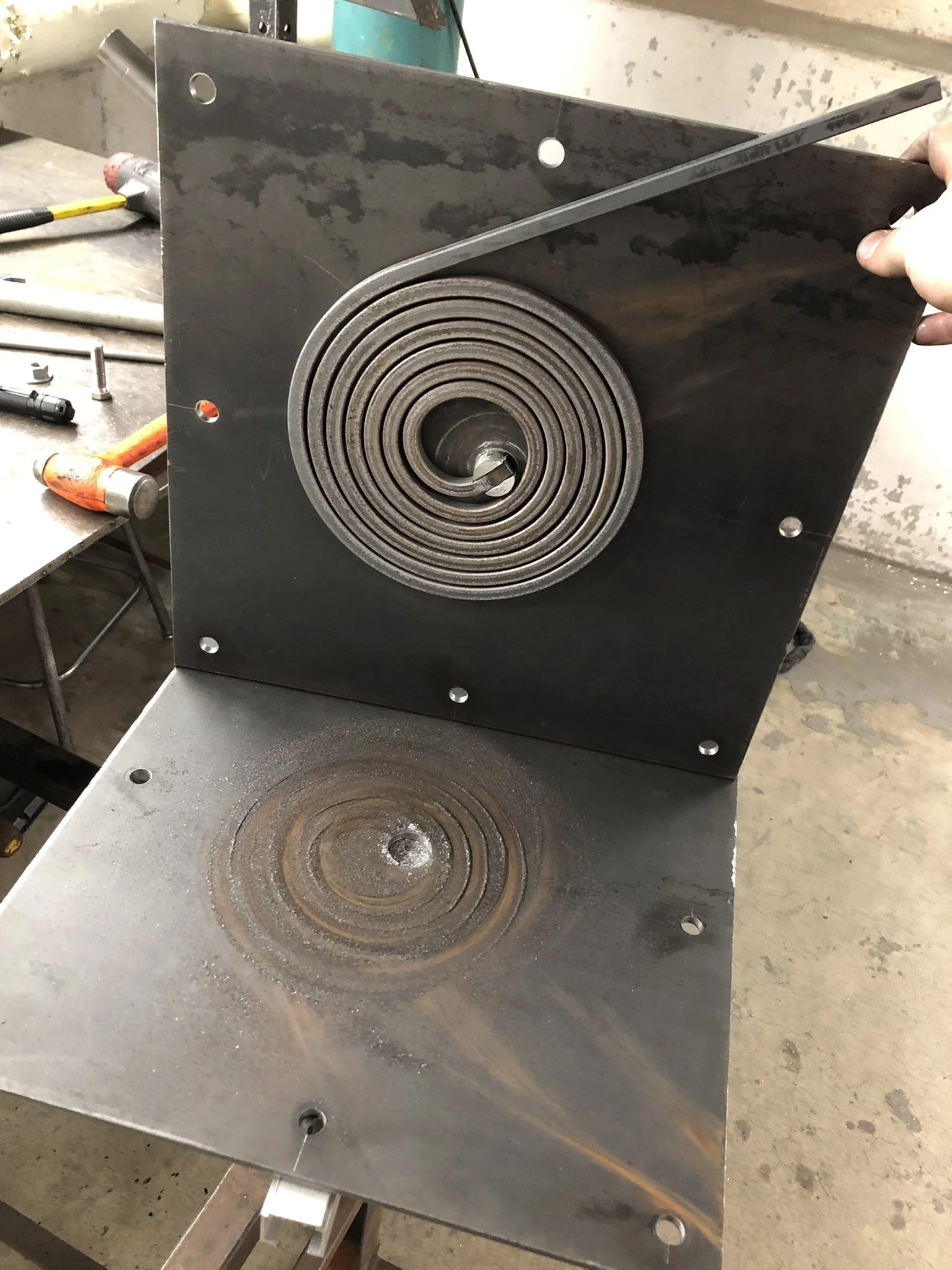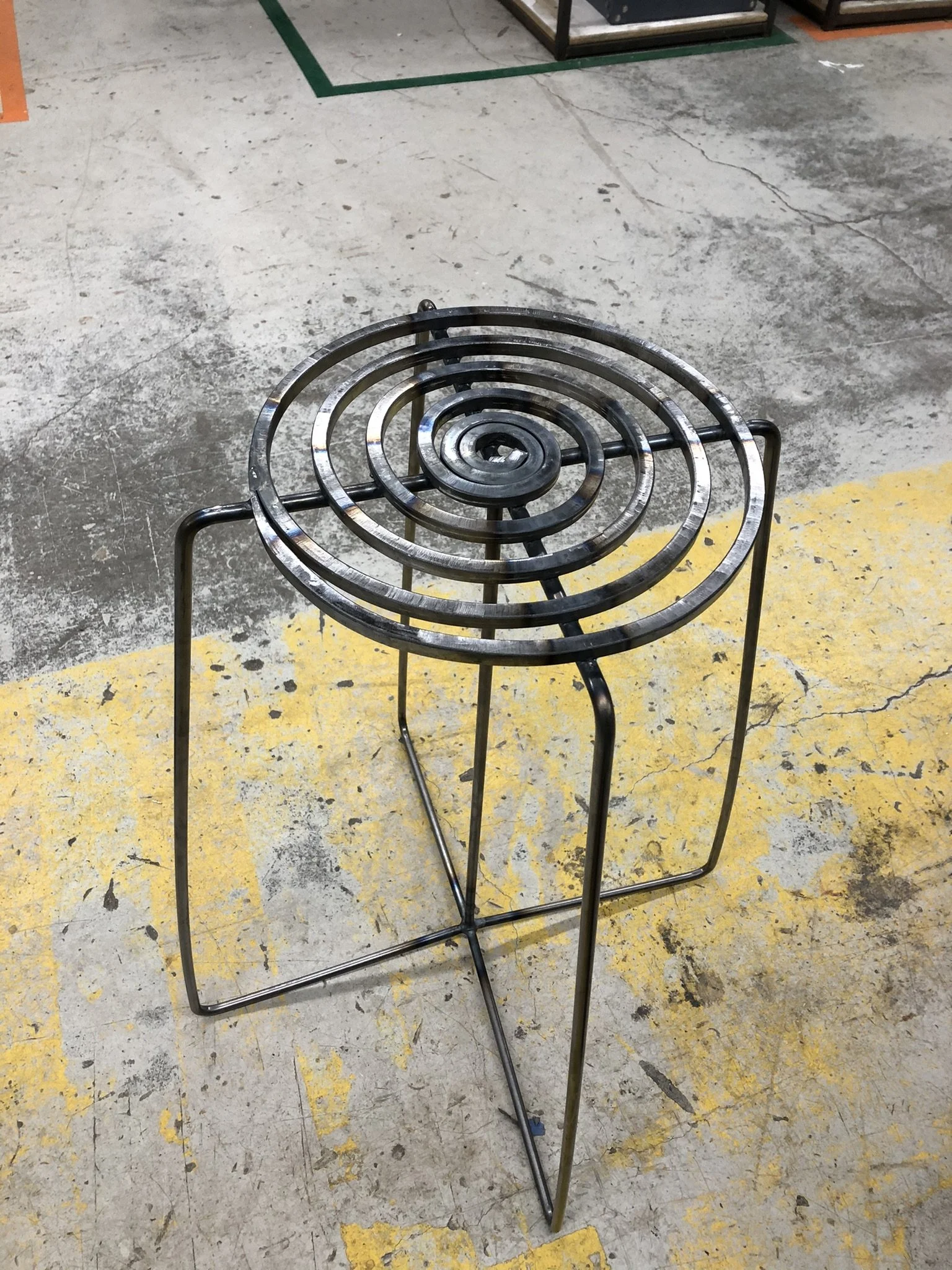 This stool is inspired by the 1960’s coil-top stove in my childhood home. When I had the opportunity to do metalworking while at RISD, I wanted to experiment with cold-forming steel, and attempting to form a large spiral seemed like an excellent challenge. I spent the majority of my allotted time experimenting with different ways to form the coil, only succeeding after numerous failed prototypes and methods.